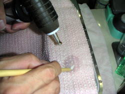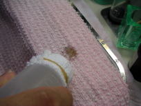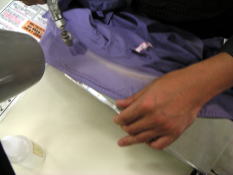 スチームガンで蒸気をあてながら漂白剤を塗ります地色を壊さないように
