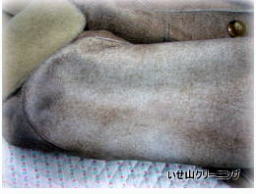 ムートン皮革の退色は多い依頼です。洗いと共に、染色補正で新品に元通りに♪