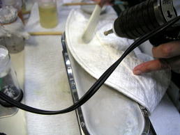 オリジナル漂白剤をぬりながらスチームを当てるとホラ〜ッどんどん色素が抜けています。その後、繊維に漂白剤が残っているので中和剤をつけます