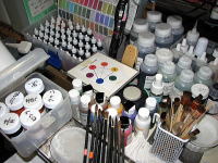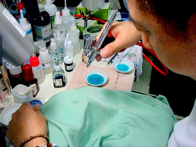 このときの染料*顔料選びまた 筆*ハケの使い方一つでも仕上がりが違うため神経集中です 色合いを見ながら 染料を乾燥させながら 完成に近づけます 最後の仕上げですこの辺が最近 家内の方が上手いんです  色掛けに使う染料と顔料のほんの一部です 和服はとても手間ひまがかかりますですので 正直使えない染料もかなりあります...泣。 最低一ヶ月は納期を頂いております ま〜使ってみないと解らないので しかたないですね