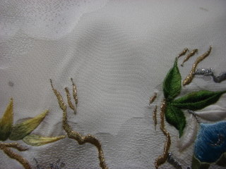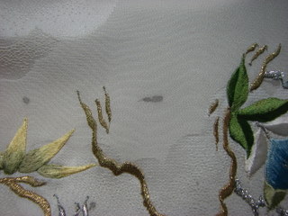 これは羽織 道行コート また 古く 染み抜きが 困難また 予算が なかったので 銀粉にて 隠蔽い(いんぺい)致しました。 肉眼では ほとんど わかりませんね ♪